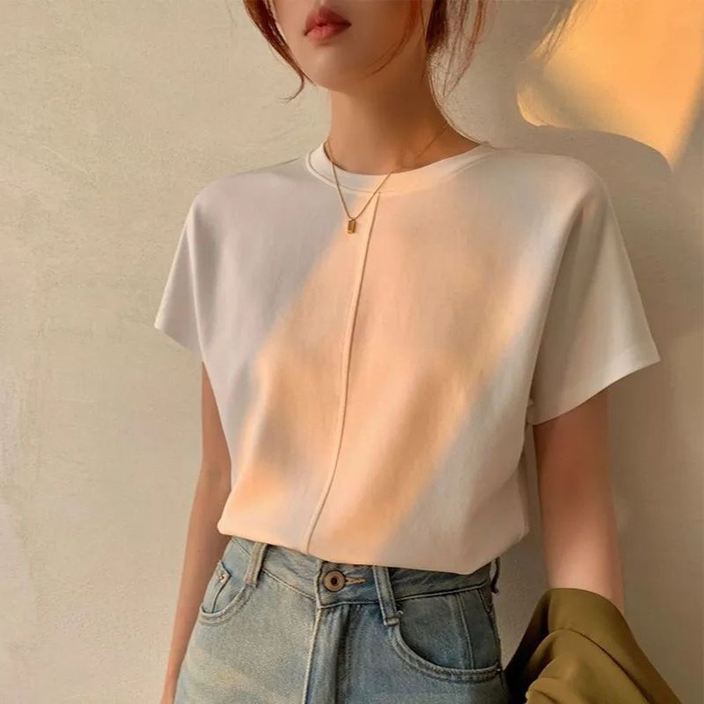 White Round Neck Straight Shoulder Short Sleeve T-Shirt Women's Top